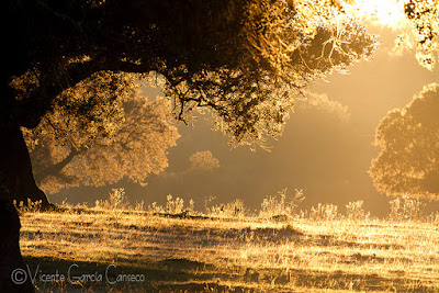 Luz rasante que acaricia a la vegetación sin discriminar entre el herbazal seco y las viejas encinas. Solo muestra lo que quiere que veamos, pero con una calidez estremecedora. Quedan en evidencia las trampas de las arañas; colgantes y entrelazadas entre los últimos resquicios del pasto, sustento de las "vacas avileñas" que recorren estos hermosos parajes.
